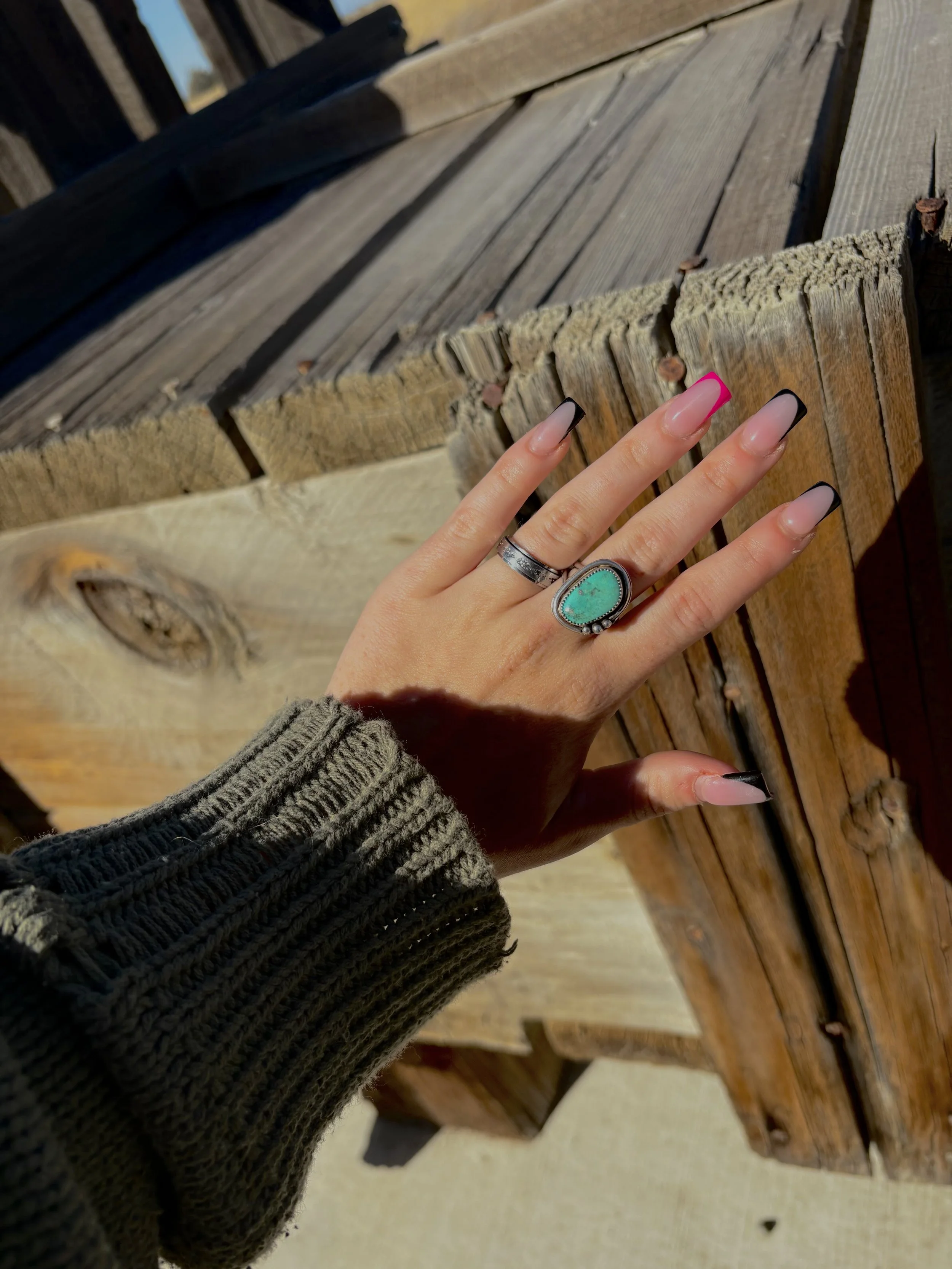 This ring is made from sterling silver and turquoise, featuring a beautiful mint green Kingman Turquoise. It is designed with delicate sterling silver peddles resembling a daisy.